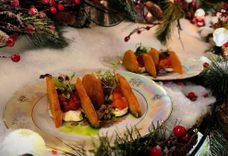 2 порции каждой позиции • Драники с тартаром из лосося (с битым огурцом и сметаной), драники с тартаром из говядины (с вяленым томатом и копченой сметаной), Папараць-кветка (жареная грудинка с картофельным пюре, маринованным огурцом и сливочным соусом из белых грибов), десерт «Анютины глазки» (пирожное картошка с жжёной ириской)